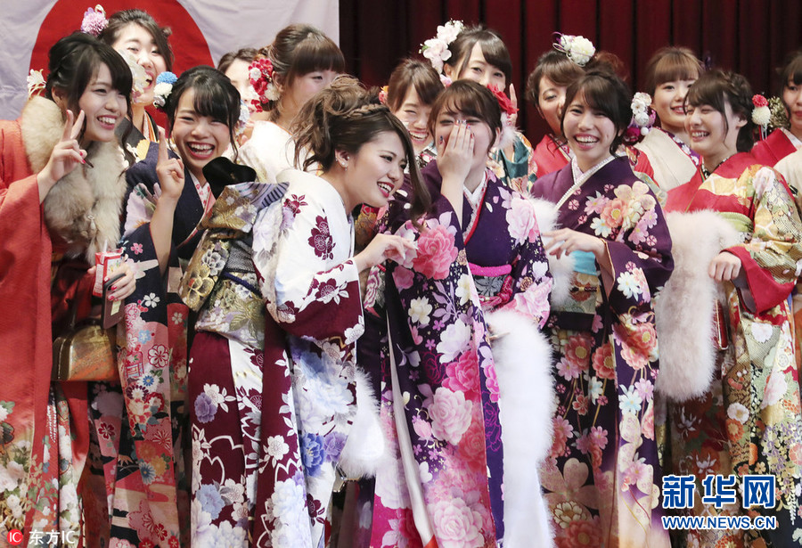 ? 1月7日,日本福岡縣北九州市,日本多地舉辦“成人節(jié)”慶祝儀式,少女們身穿和服盛裝出席。(圖片來(lái)源:東方IC)