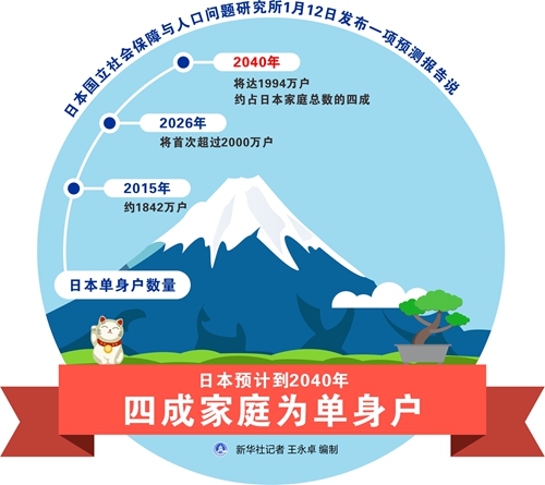 新華社東京1月13日電(記者華義)日本國立社會保障與人口問題研究所12日發(fā)布一項預(yù)測報告說,到2040年日本單身戶將占日本家庭總數(shù)的約四成。日本老齡化和獨居現(xiàn)象日益加劇。