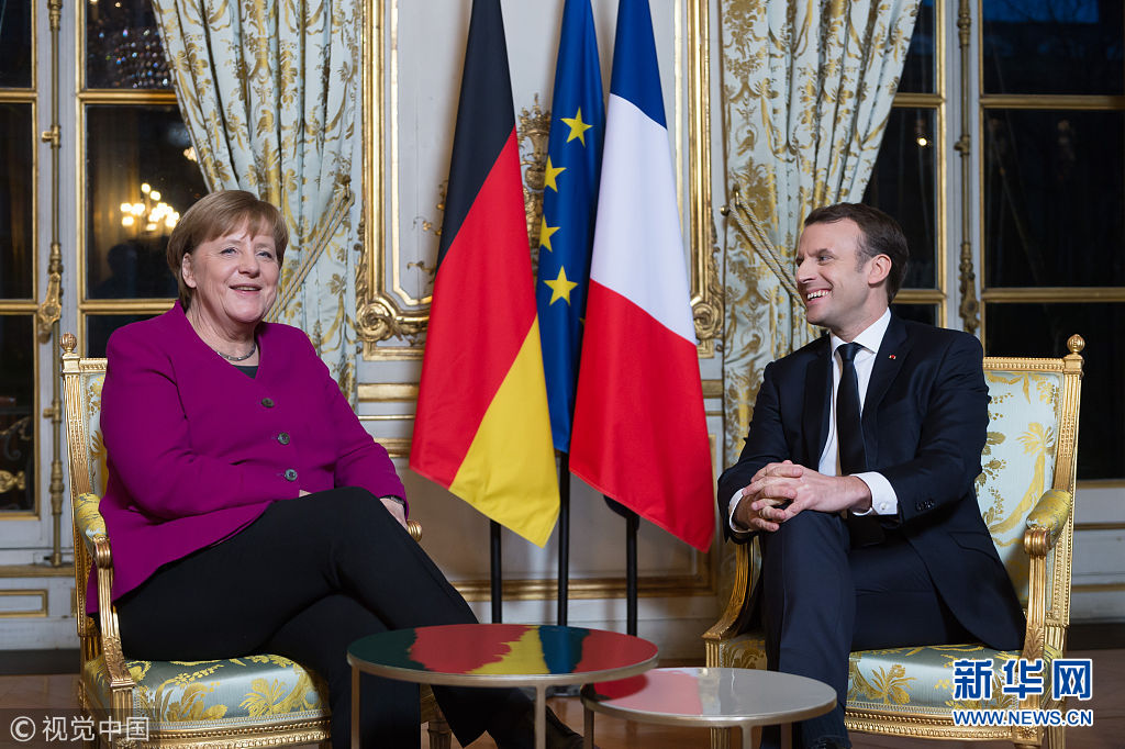 當?shù)貢r間2018年1月19日,法國巴黎,法國總統(tǒng)馬克龍在愛麗舍宮會晤到訪的德國總理默克爾,表示在推動歐洲改革的進程中,法國需要德國。馬克龍以此對面臨大選后組閣危機的默克爾表達支持。馬克龍在會后強調(diào)了法德合作的重要性。他表示,法國無法單獨實現(xiàn)自身的抱負,需要與德國的抱負結(jié)合起來。