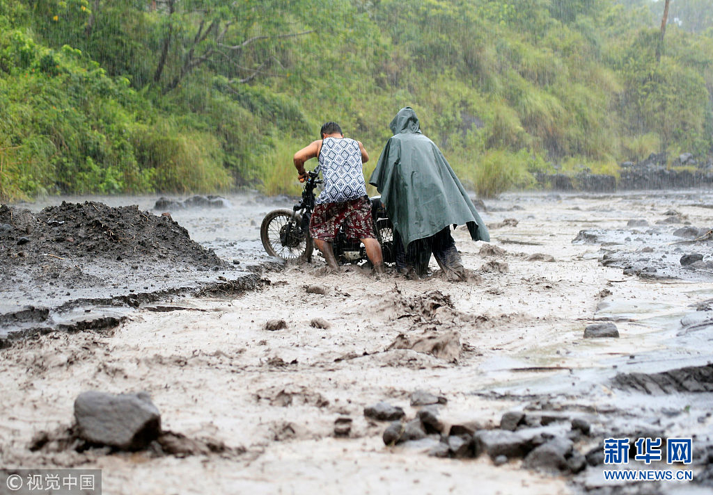 當(dāng)?shù)貢r(shí)間2018年1月27日,菲律賓阿爾拜省,民眾穿過(guò)混合著火山灰的泥漿河。(圖片來(lái)源:視覺(jué)中國(guó))