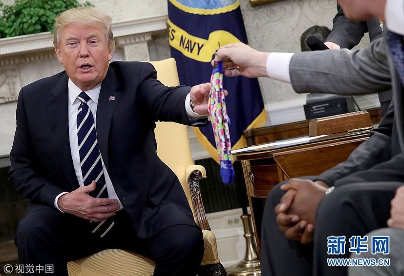 美國總統(tǒng)特朗普與公司職員討論稅改 獲贈(zèng)一雙花襪子