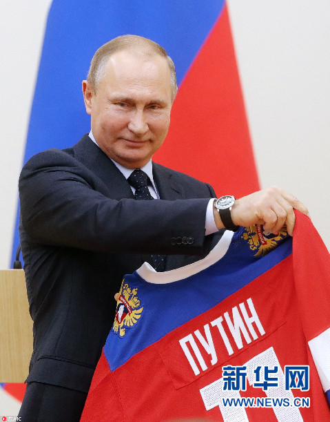 當(dāng)?shù)貢r(shí)間1月31日,俄羅斯莫斯科,普京會(huì)見(jiàn)征戰(zhàn)平昌冬奧會(huì)的俄羅斯運(yùn)動(dòng)員,獲俄冰球隊(duì)贈(zèng)送簽名球衣。(圖片來(lái)源:東方IC)
