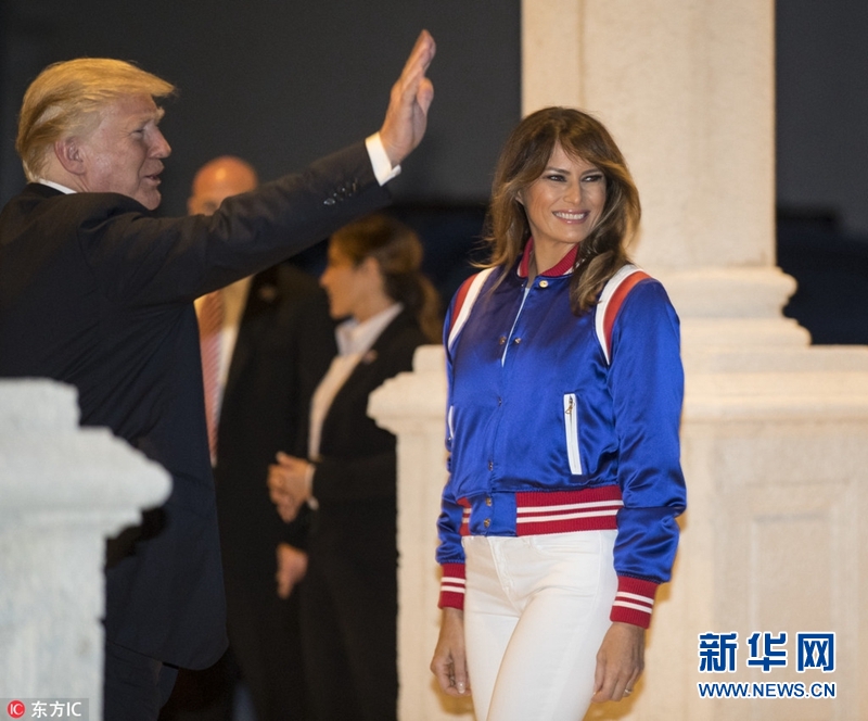 當(dāng)?shù)貢r(shí)間2018年2月4日,美國(guó)佛州西棕櫚灘,美國(guó)總統(tǒng)特朗普與第一夫人梅拉尼婭在高爾夫俱樂(lè)部觀看大學(xué)生樂(lè)隊(duì)的歡迎演出,與美女啦啦隊(duì)員握手。據(jù)悉,特朗普夫婦出席在該俱樂(lè)部舉辦的超級(jí)碗派對(duì)。(圖片來(lái)源:東方IC)