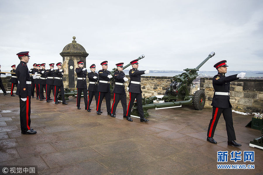 英國(guó)皇家炮兵在愛(ài)丁堡城堡鳴響21響禮炮 紀(jì)念女王登基66周年
