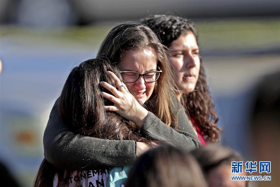 2月14日,在美國佛羅里達州帕克蘭市發(fā)生槍擊的高中,安全撤離的學生相擁而泣。美國佛羅里達州布勞沃德縣警方14日說,當?shù)匾桓咧邪l(fā)生的槍擊案已造成17人死亡。 新華社/美聯(lián)