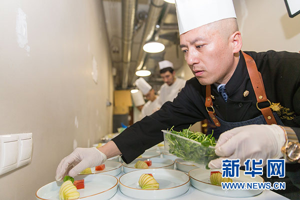 2月19日,在俄羅斯首都莫斯科,俄方廚師為菜品擺盤。新華社記者 白雪騏 攝