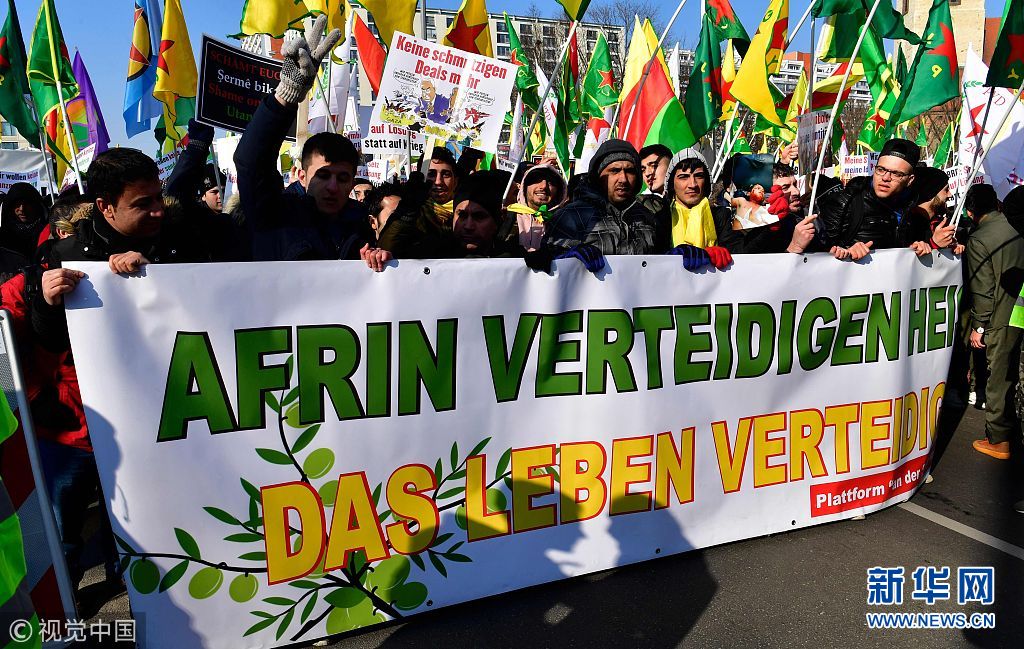 當(dāng)?shù)貢r(shí)間2018年3月3日,德國(guó)柏林,當(dāng)?shù)孛癖娕e行游行,抗議土耳其對(duì)敘利亞阿夫林地區(qū)的庫(kù)爾德人采取軍事行動(dòng)。(圖片來(lái)源:視覺(jué)中國(guó))