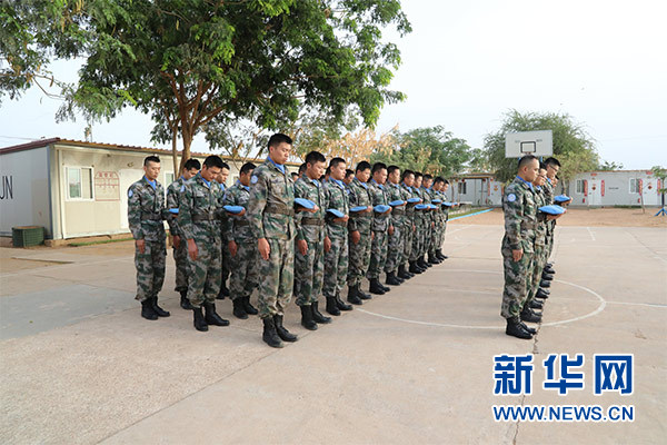 祭奠儀式上,大型機械鳴笛三聲,哀思樂曲響起,全體官兵整裝列隊,集體脫帽為犧牲在維和戰(zhàn)場上的英烈默哀三分鐘。隨后,官兵代表致辭,追憶維和英烈們無私奉獻、舍生取義的光輝事跡,表達為達爾富爾地區(qū)和平建設而努力奮斗的堅定決心。