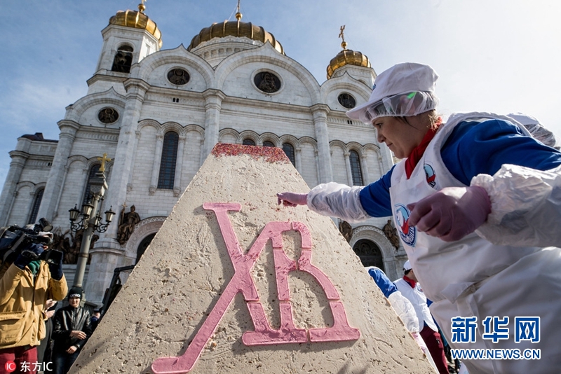 當?shù)貢r間2018年4月8日,俄羅斯莫斯科,為慶祝東正教復活節(jié),莫斯科救世主大教堂前現(xiàn)一個1141公斤的傳統(tǒng)復活節(jié)蛋糕,打破吉尼斯世界紀錄。(圖片來源:東方IC)