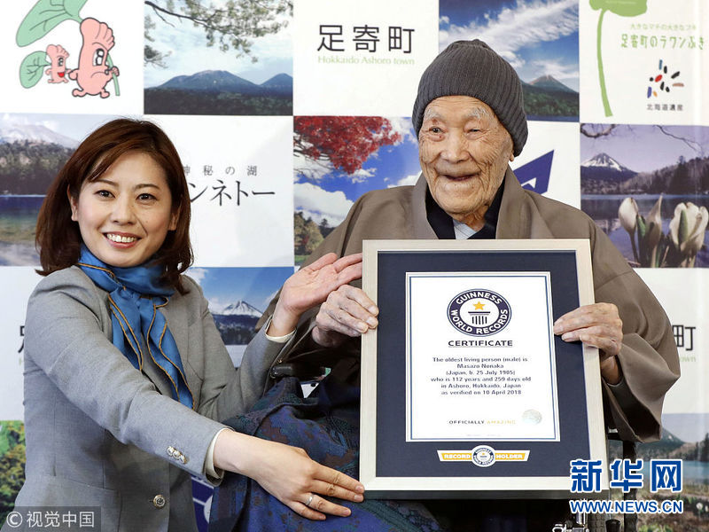 4月10日,日本足寄,日本男子Masazo Nonaka以112歲259天的年齡,獲得吉尼斯認證的世界目前在世年齡最長的男性。 (圖片來源:視覺中國)