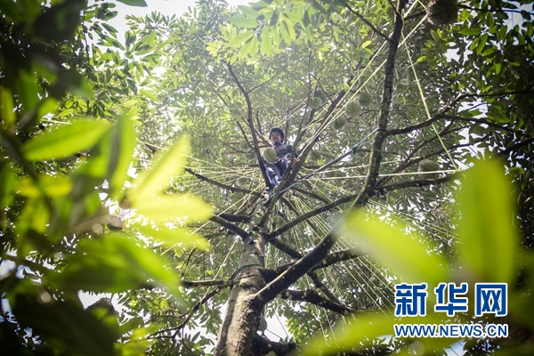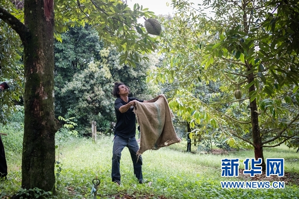 新華網(wǎng)曼谷4月24日電(陳家寶)23日清晨,在泰國(guó)曼谷以東約250公里的莊他武里府的果園里,綴滿榴蓮的高樹(shù)上,黝黑的果農(nóng)爬上枝椏,割下一個(gè)個(gè)約3公斤重的果實(shí)。