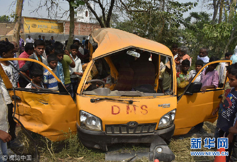 當(dāng)?shù)貢r間2018年4月26日,一輛載有22名兒童的校車在印度北方邦庫新加同一輛火車相撞,事故造成13名兒童死亡,8人傷勢嚴重。(圖片來源:視覺中國)