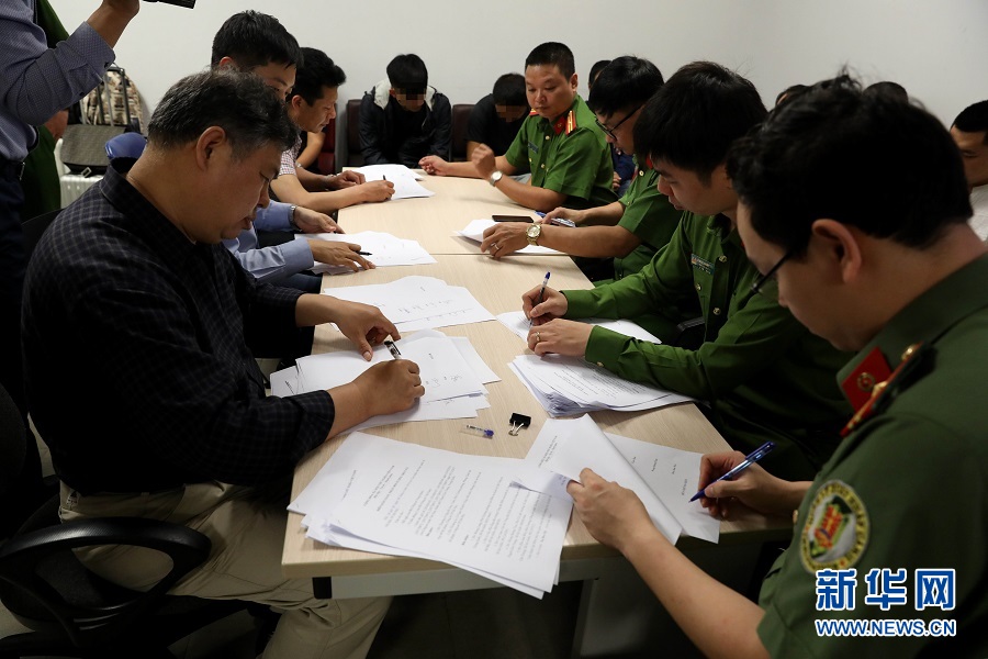 4月28日,中越警方簽署移交相關文件。當日,越南警方在河內內排國際機場向中國警方工作組移交了許某等8名涉嫌詐騙罪的在逃嫌疑人。中國警方“獵狐行動”在越南再獲新成果。新華社記者王迪攝