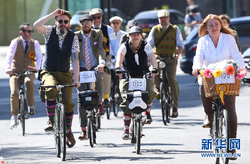 當(dāng)?shù)貢r(shí)間2018年5月5日,英國倫敦,當(dāng)?shù)嘏e辦復(fù)古騎行活動(dòng),民眾身穿花呢子服裝騎車穿行在倫敦街頭。今年是該活動(dòng)舉辦十周年。(圖片來源:東方IC)