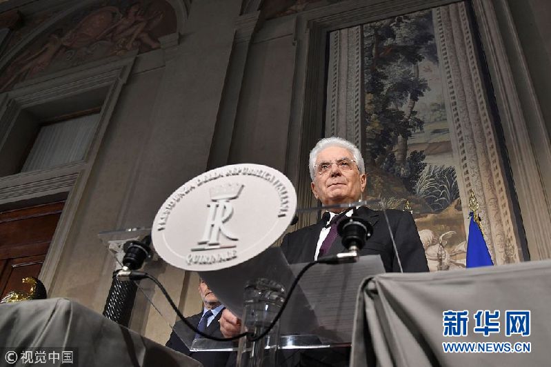當(dāng)?shù)貢r(shí)間2018年5月7日,意大利羅馬,意大利總統(tǒng)塞爾焦·馬塔雷拉7日召集新一輪組閣談判并出席新聞發(fā)布會(huì)。如果所有組閣努力失敗,馬塔雷拉將授權(quán)組建技術(shù)官僚組成的過(guò)渡政府。(圖片來(lái)源:視覺(jué)中國(guó))