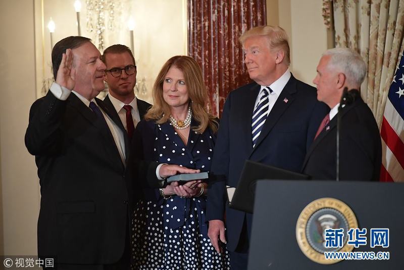 資料圖:5月2日,美國(guó)華盛頓,邁克·蓬佩奧在總統(tǒng)特朗普的見證下正式宣誓就職美國(guó)國(guó)務(wù)卿。新華網(wǎng)發(fā)