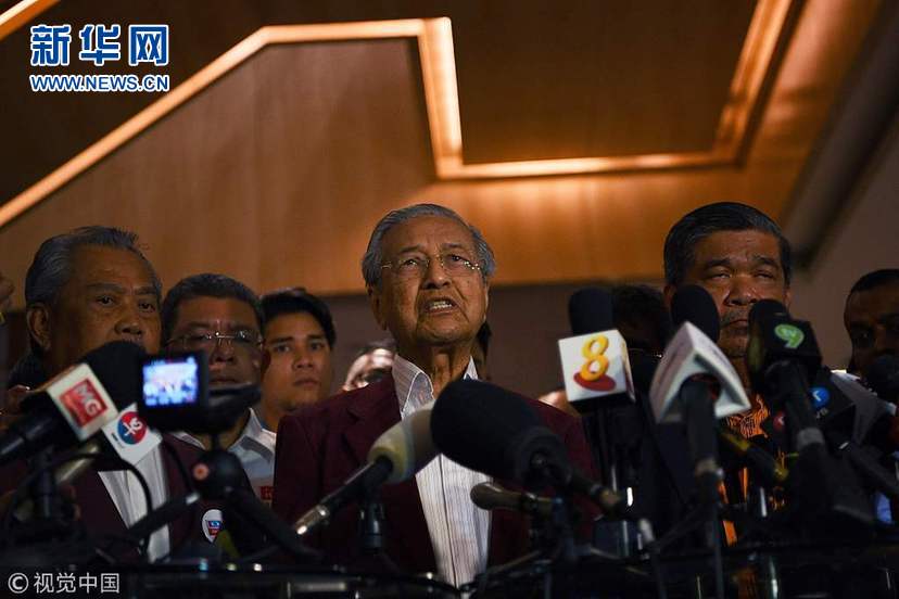 當(dāng)?shù)貢r間2018年5月9日,馬來西亞吉隆坡,馬哈蒂爾代表希望聯(lián)盟召開新聞發(fā)布會。9日,馬來西亞國會大選結(jié)束。10日凌晨官方點(diǎn)票結(jié)果顯示,前總理馬哈蒂爾(Mahathir)帶領(lǐng)的希望聯(lián)盟取得112席簡單多數(shù)國會議席,足以籌組政府及勝出大選,并終結(jié)執(zhí)政國民陣線長達(dá)60年的管治。現(xiàn)總理納吉布領(lǐng)導(dǎo)的國民陣線僅獲得76席。(圖片來源:視覺中國)