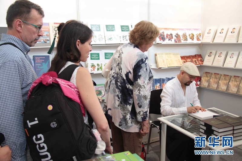 當?shù)刈x者排隊請戎新宇在其著作上簽名留念。新華網(wǎng)發(fā)