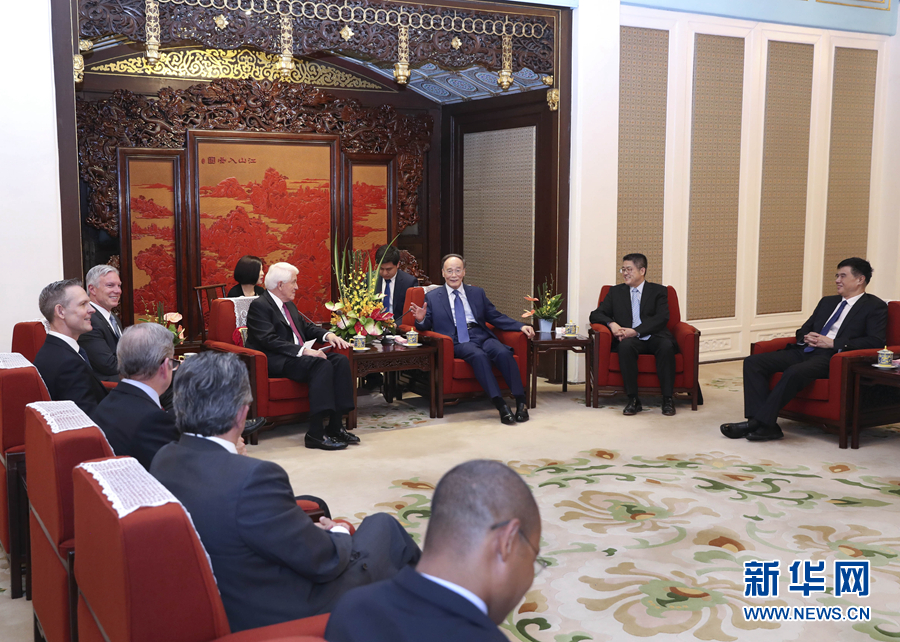 5月15日,國(guó)家副主席王岐山在北京中南海會(huì)見(jiàn)出席第十輪中美工商領(lǐng)袖和前高官對(duì)話的美方代表。 新華社記者 龐興雷 攝