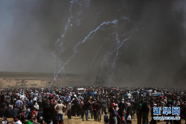 5月14日,在加沙城以東的加沙地帶與以色列交界地區(qū),巴勒斯坦示威者與以色列軍隊(duì)發(fā)生沖突。巴勒斯坦民眾14日在巴各地舉行大規(guī)模游行示威,抗議美國(guó)駐以色列使館在耶路撒冷開館。新華社發(fā)
