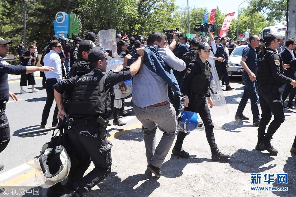 5月15日,土耳其安卡拉,示威者在以色列領事館附近投擲雞蛋和石塊,抗議美國駐以色列使館遷至耶路撒冷。(圖片來源:視覺中國)