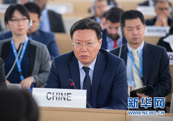 5月18日,在瑞士日內(nèi)瓦萬國宮,中國常駐聯(lián)合國日內(nèi)瓦辦事處和瑞士其他國際組織代表俞建華(中)出席聯(lián)合國人權(quán)理事會(huì)加沙局勢(shì)特別會(huì)議。新華社記者 徐金泉 攝