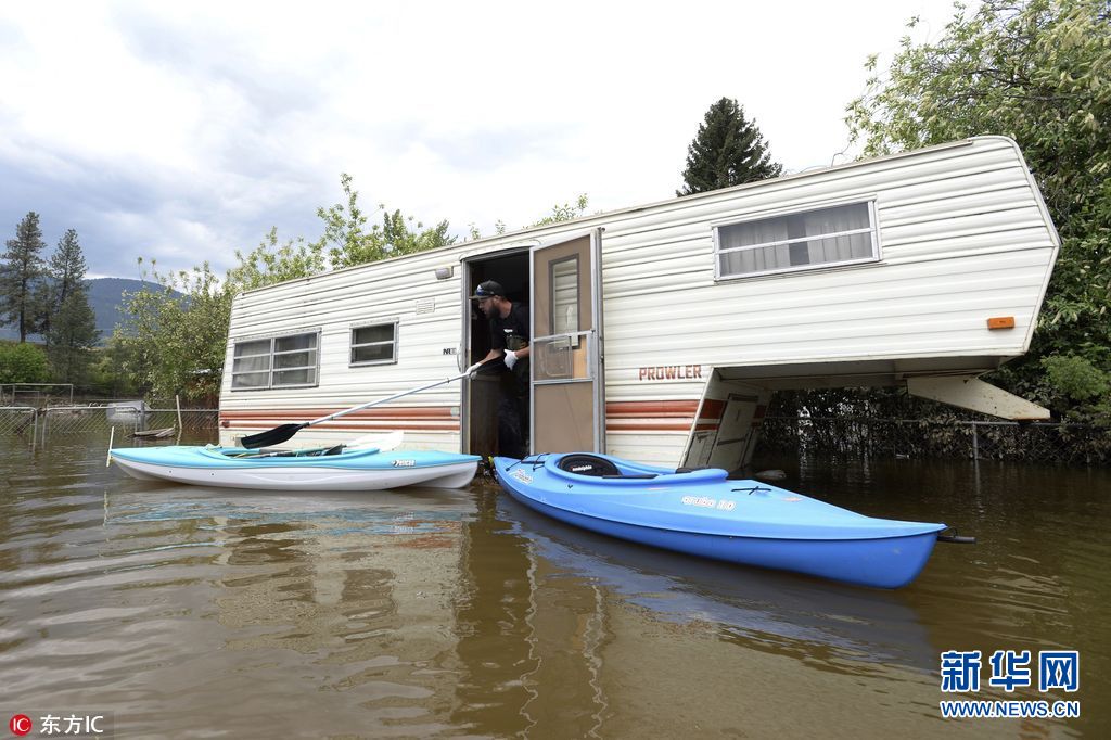 5月17日,加拿大不列顛哥倫比亞省Grand Forks,當(dāng)?shù)卦夂樗u擊,房屋、車輛浸泡水中。(圖片來源:東方IC)