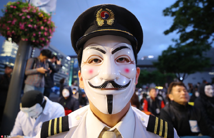 當(dāng)?shù)貢r(shí)間2018年5月18日,韓國(guó)首爾,大韓航空有限公司的飛行員戴著蓋伊·??怂姑婢?,在首爾市區(qū)集會(huì)抗議,反對(duì)大韓航空會(huì)長(zhǎng)兼首席執(zhí)行官趙亮鎬及其家庭。