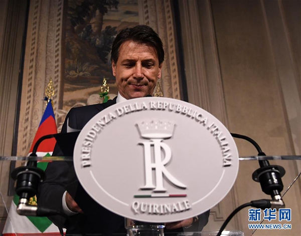 5月27日,在意大利首都羅馬,意新任總理孔特發(fā)表講話(huà)。據(jù)當(dāng)?shù)孛襟w報(bào)道,孔特27日晚間與總統(tǒng)馬塔雷拉會(huì)面并提交擬定的內(nèi)閣成員名單時(shí),馬塔雷拉否決了由意大利聯(lián)盟黨和五星運(yùn)動(dòng)力推的持疑歐立場(chǎng)的經(jīng)濟(jì)學(xué)家保羅·薩沃納出任財(cái)政部長(zhǎng)??滋叵蚩偨y(tǒng)提出放棄組閣任務(wù)請(qǐng)求,請(qǐng)求得到總統(tǒng)確認(rèn)。新華社發(fā)(阿爾貝托·林格里亞攝)