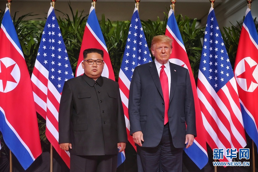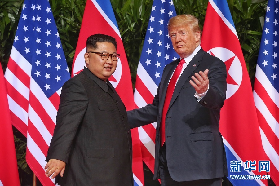 6月12日,朝鮮最高領(lǐng)導(dǎo)人金正恩(左)與美國(guó)總統(tǒng)特朗普在新加坡舉行會(huì)晤。 新華社發(fā)(新加坡海峽時(shí)報(bào)供圖)