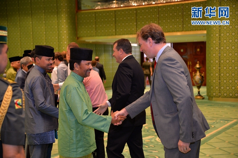 文萊蘇丹哈桑納爾·博爾基亞16日在努洛伊曼王宮與一名外國(guó)駐文萊外交官握手致意。新華網(wǎng)發(fā) 杰弗里·黃攝