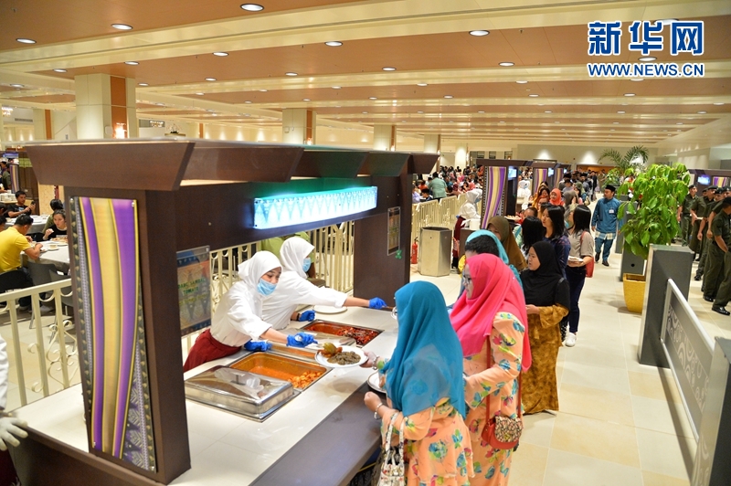 圖為16日在文萊王宮努洛伊曼宮拍攝的排隊(duì)取用自助餐的訪客。新華網(wǎng)發(fā) 杰弗里·黃攝