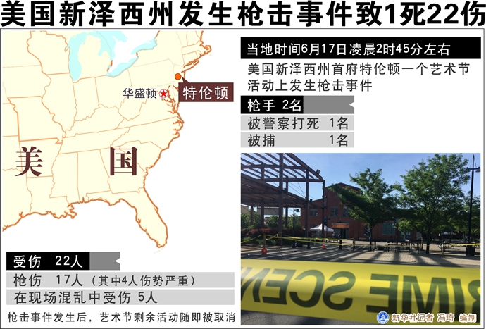 新華社華盛頓6月17日電(記者劉陽 孫丁)美國新澤西州首府特倫頓17日凌晨發(fā)生槍擊事件,一名槍手被打死,另有22人受傷。