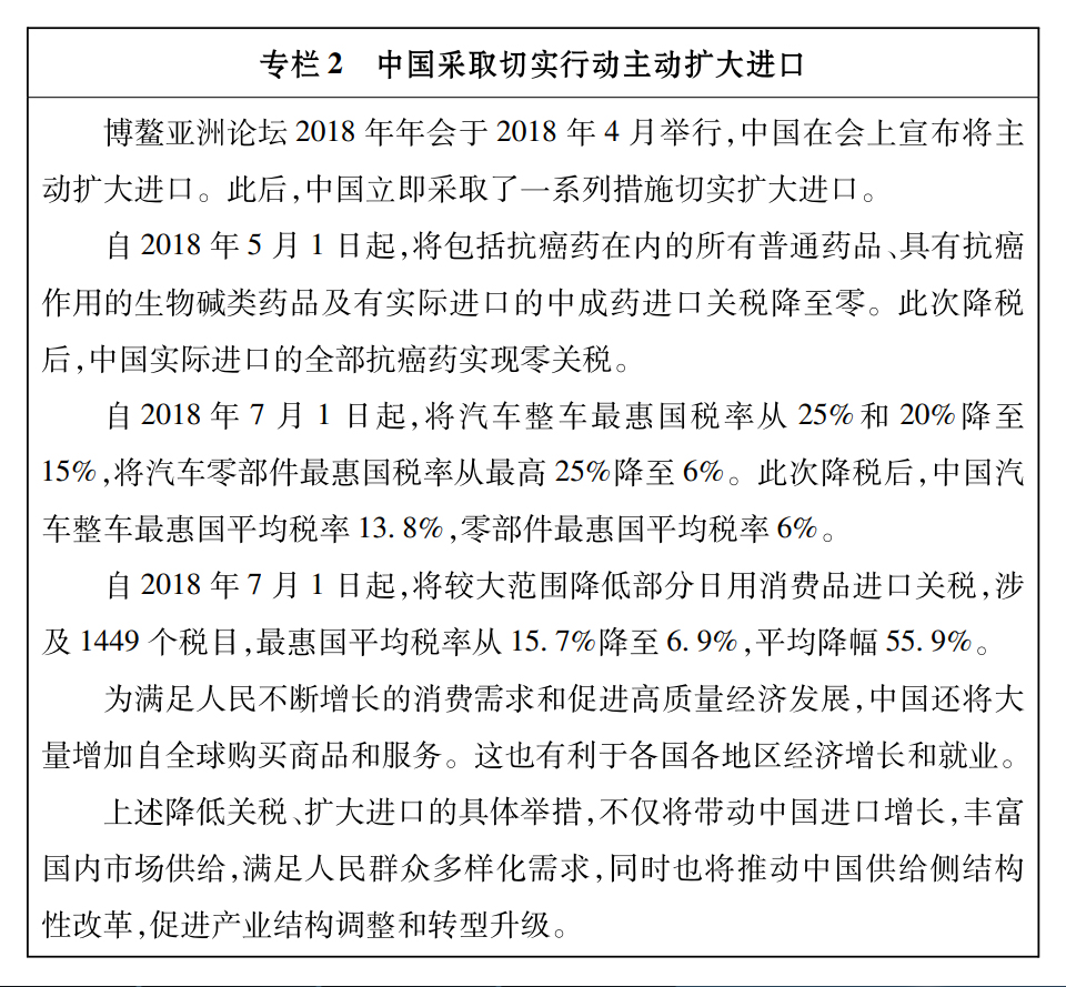 站在新時(shí)代的歷史起點(diǎn)上,中國(guó)開放的大門不會(huì)關(guān)閉,只會(huì)越開越大。中國(guó)過(guò)去40年的經(jīng)濟(jì)發(fā)展是在開放條件下取得的,未來(lái)中國(guó)經(jīng)濟(jì)實(shí)現(xiàn)高質(zhì)量發(fā)展也將在更加開放條件下進(jìn)行。中國(guó)將繼續(xù)堅(jiān)持對(duì)外開放基本國(guó)策,以更加積極的姿態(tài)融入經(jīng)濟(jì)全球化進(jìn)程,實(shí)行高水平的貿(mào)易和投資自由化便利化政策,與各國(guó)構(gòu)建利益高度融合、彼此相互依存的命運(yùn)共同體。