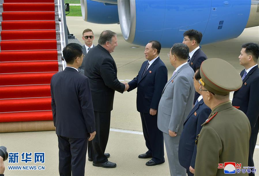 朝中社7月7日提供的照片顯示,美國(guó)國(guó)務(wù)卿蓬佩奧在朝鮮平壤與在機(jī)場(chǎng)迎接的朝鮮勞動(dòng)黨中央委員會(huì)副委員長(zhǎng)金英哲握手。新華社/朝中社
