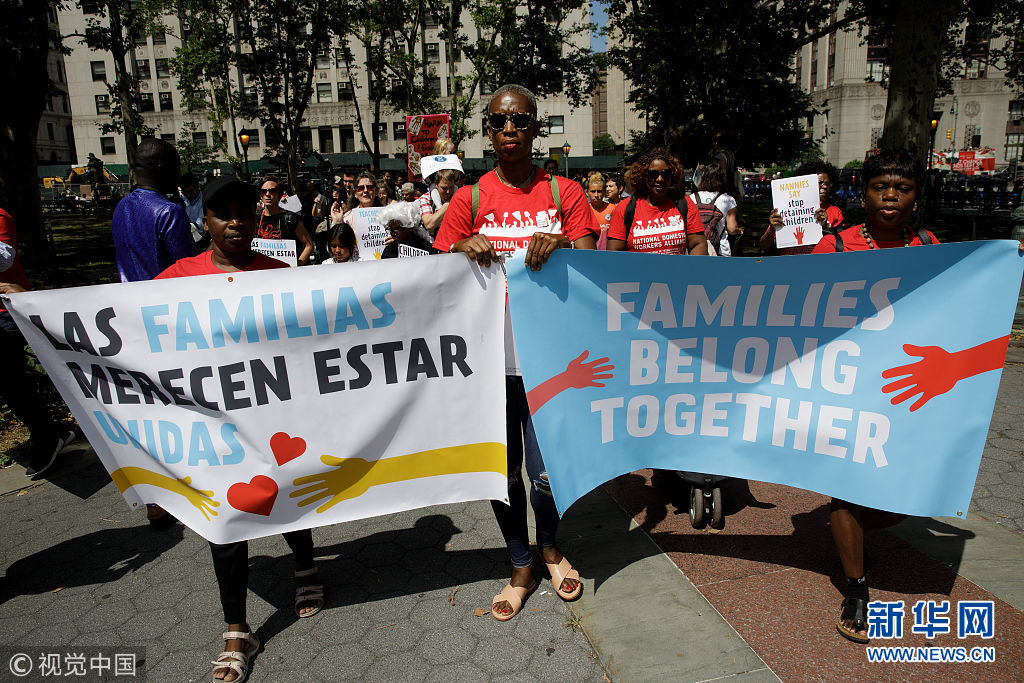 當?shù)貢r間2018年7月18日,美國紐約,包括托兒所從業(yè)人員、父母及其子女在內(nèi)的社會各界人士在美國移民和海關(guān)執(zhí)法局(ICE)附近組織示威游行,抗議特朗普政府近期在美國南部邊境實施針對非法移民家庭的強制拘留和家庭成員離散政策。 當天,共和黨領(lǐng)導的眾議院通過了支持ICE的決議,并譴責一些民主黨人和進步積極分子要求廢除ICE的呼聲。(圖片來源:視覺中國)