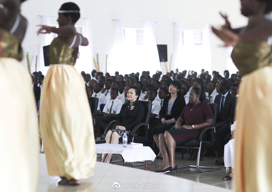 23日上午,國(guó)家主席習(xí)近平夫人彭麗媛參觀了盧旺達(dá)法維女子中學(xué)。全校師生聚集在學(xué)校大禮堂,歡迎中國(guó)貴賓到來(lái)。當(dāng)彭麗媛走進(jìn)會(huì)場(chǎng)時(shí),掌聲雷動(dòng)。同學(xué)們?yōu)榕睇愭鲁噬狭艘粓?chǎng)精彩演出:學(xué)校校歌合唱高亢激昂、中國(guó)經(jīng)典名曲《茉莉花》悠揚(yáng)嘹亮、盧旺達(dá)民族舞蹈熱情奔放。彭麗媛不斷為學(xué)生的出色表演鼓掌。演出結(jié)束后,彭麗媛向?qū)W校贈(zèng)送了一批教學(xué)用品,祝愿學(xué)校越來(lái)越好。一位同學(xué)向彭麗媛贈(zèng)送了一幅自己專門創(chuàng)作的畫像。彭麗媛高興地接過(guò)畫像大加稱贊,親吻這位同學(xué)的臉頰,并同她親切擁抱。彭麗媛對(duì)全校師生的熱情接待表示感謝。
