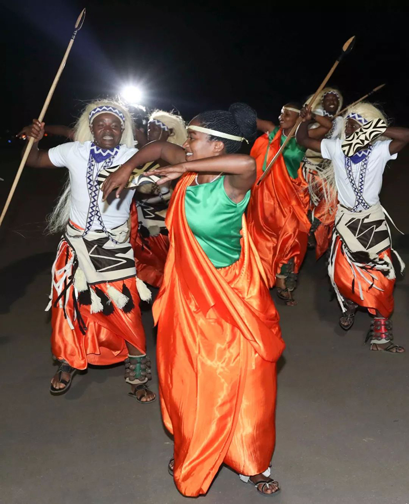 夜色中,盧旺達(dá)民眾跳起熱情的民族舞,歡迎習(xí)近平主席和夫人彭麗媛。新華社記者 龐興雷攝