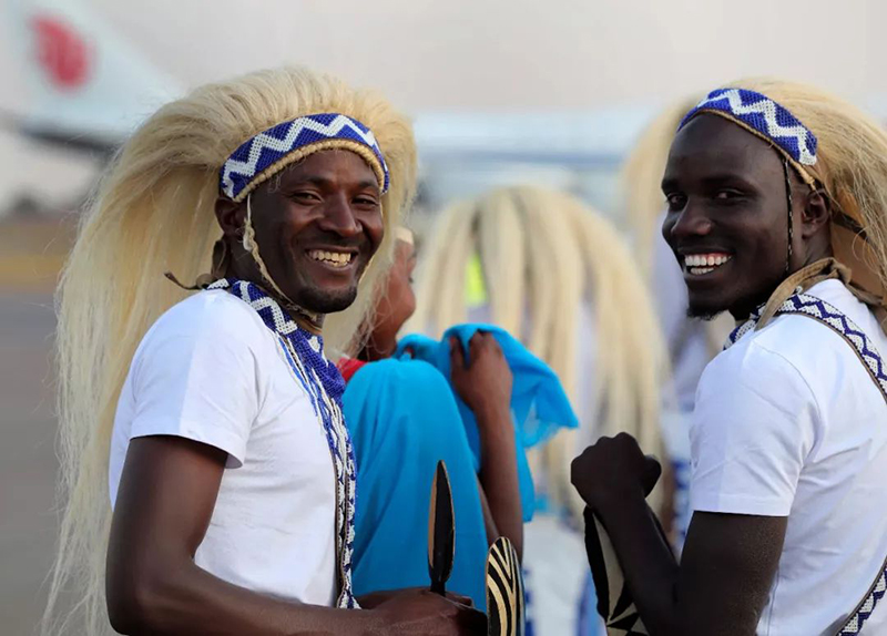 在機(jī)場舉行的歡送儀式上,身著民族服裝的盧旺達(dá)民眾。新華社記者 龐興雷攝