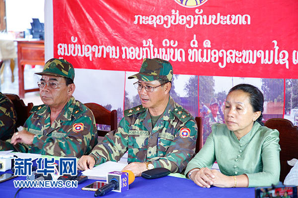 7月28日,老撾人民軍總參謀部副總參謀長、潰壩事故救援總指揮坎良·烏塔凱山(中)在災(zāi)區(qū)薩南賽縣舉行的救援情況發(fā)布會(huì)上說,截至當(dāng)晚,潰壩事故的救援力量共發(fā)現(xiàn)8具遇難者遺體,仍有123人生死不明。新華社發(fā)