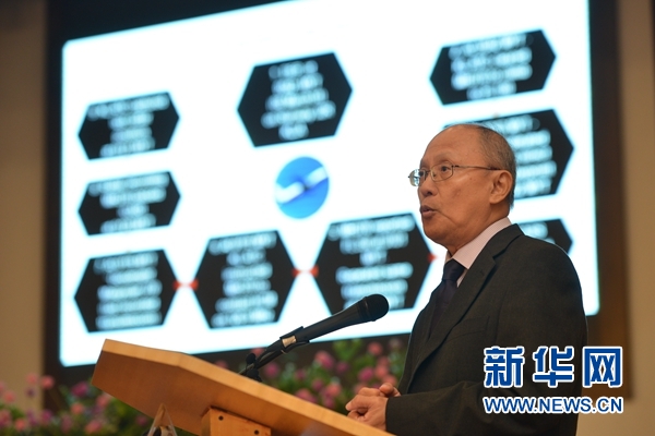 7月30日,馬航370航班客機(jī)安全調(diào)查組負(fù)責(zé)人郭師傳(右二)在馬來西亞普特拉賈亞舉行的新聞發(fā)布會上講話。 新華社發(fā)(張紋綜攝)