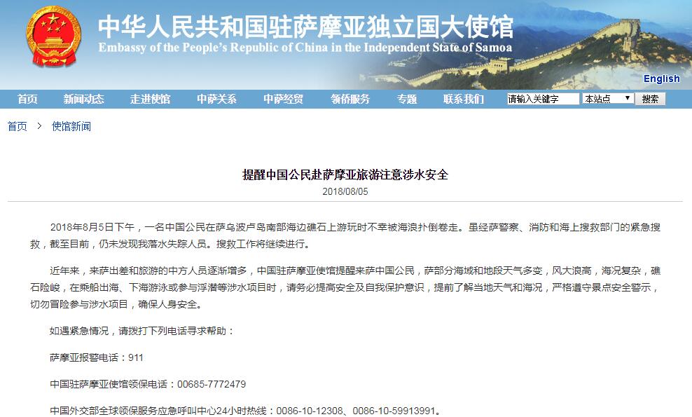 據(jù)中國(guó)駐薩摩亞大使館網(wǎng)站消息,當(dāng)?shù)貢r(shí)間2018年8月5日下午,一名中國(guó)公民在薩烏波盧島南部海邊礁石上游玩時(shí)不幸被海浪撲倒卷走。雖經(jīng)薩警察、消防和海上搜救部門的緊急搜救,截至目前,仍未發(fā)現(xiàn)落水失蹤人員。搜救工作將繼續(xù)進(jìn)行。