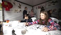 圍繞著中央舞臺(tái),剪紙、書法、針灸等展位前人頭攢動(dòng),吸引了許多聞?dòng)嵍鴣?lái)的華僑華人和當(dāng)?shù)孛癖?。巴西瓦加斯基金?huì)華人教授夏華聲帶著兩個(gè)兒子前來(lái)參加活動(dòng)。