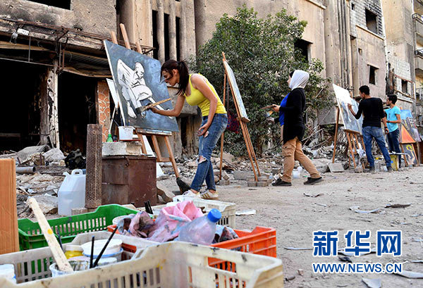8月16日,在敘利亞首都大馬士革,年輕畫(huà)家們?cè)谝疇柲驴穗y民營(yíng)廢墟前作畫(huà)。? 新華社發(fā)(阿馬爾 攝)
