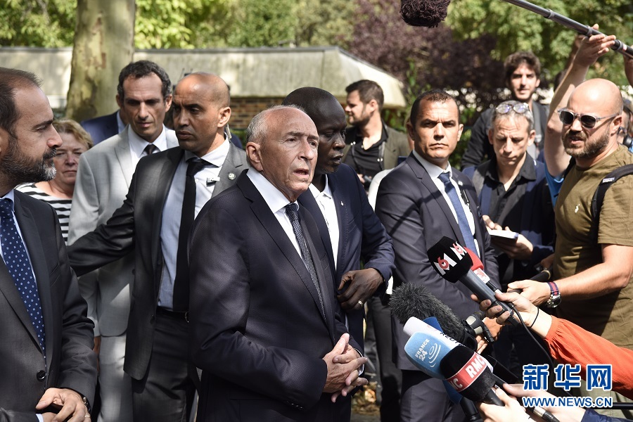 8月23日,在法國巴黎西南郊特拉普市,法國內(nèi)政部長科?。ㄖ校┫蛎襟w介紹情況。 新華社記者陳益宸攝