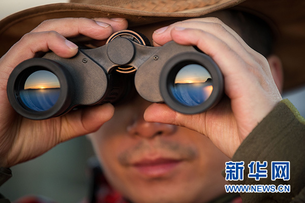 7月7日,在肯尼亞馬賽馬拉大草原奧肯耶保護(hù)區(qū),卓強(qiáng)用望遠(yuǎn)鏡觀察保護(hù)區(qū)情況。新華社記者 呂帥 攝