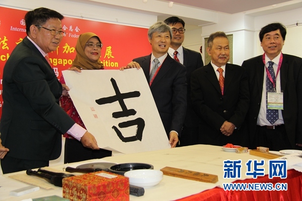 新加坡馬來族女總統(tǒng)哈莉瑪興致勃勃地揮毫?xí)鴮懥藵h字“吉”,并觀賞了書法家代表的現(xiàn)場書法表演。哈莉瑪在賀詞中說,中華書法是眾多新加坡人學(xué)習(xí)的傳統(tǒng)藝術(shù),新加坡書法家協(xié)會通過開設(shè)書法課程和舉辦揮春大會等方式,在新加坡多元文化背景下為加深跨文化交流做出了貢獻。此次國際書法交流大展展出的作品風格各異,無疑能帶動書法同道的藝術(shù)交流。