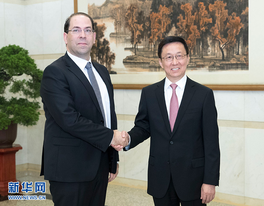 9月5日,中共中央政治局常委、國務(wù)院副總理韓正在北京釣魚臺國賓館會見突尼斯總理沙赫德。 新華社記者 王曄 攝