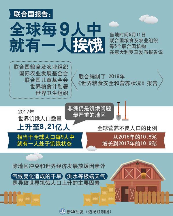 聯(lián)合國報(bào)告:全球每9人中就有一人挨餓。新華社發(fā) 邊紀(jì)紅 制圖