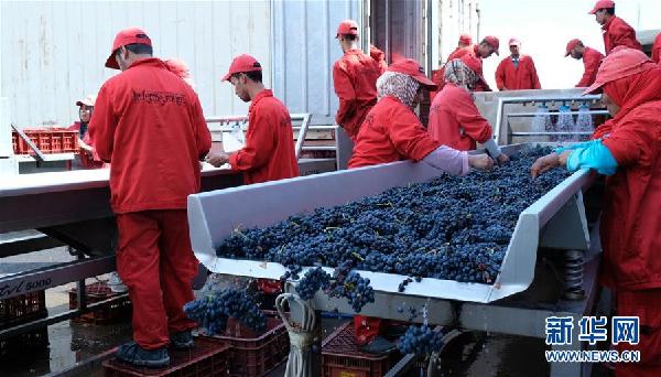 10月1日,在摩洛哥小鎮(zhèn)魯馬尼,紅農(nóng)場酒莊的工作人員對收獲的葡萄進(jìn)行清洗加工。 據(jù)紅農(nóng)場總經(jīng)理馬蒙·薩耶介紹,該酒莊正在擴(kuò)大產(chǎn)能,希望通過參加首屆中國國際進(jìn)口博覽會,將摩洛哥葡萄酒引進(jìn)中國市場。首屆中國國際進(jìn)口博覽會將于11月5日至10日在上海舉行。目前已有130多個國家和地區(qū)的2800多家企業(yè)確認(rèn)參展。 新華社記者陳斌杰攝